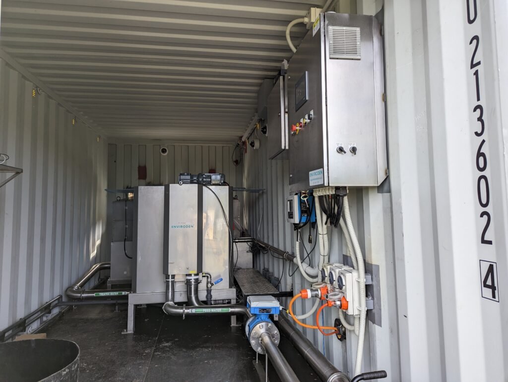 This customer needed a removable treatment system that would automatically dredge the pond sludge and dewater it. The dredge runs back and forth and will automatically alter dredging depth to maintain Wave feed TSS concentration between 2-8% dry solids concentration. We installed three cameras and have a remote access SCADA system with trending. The pontoon dredge and the Wave PLC communicate wirelessly.