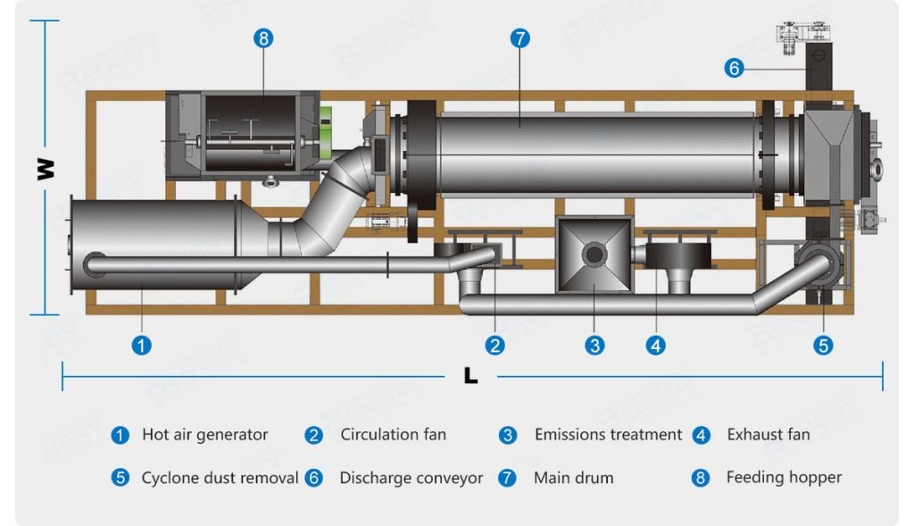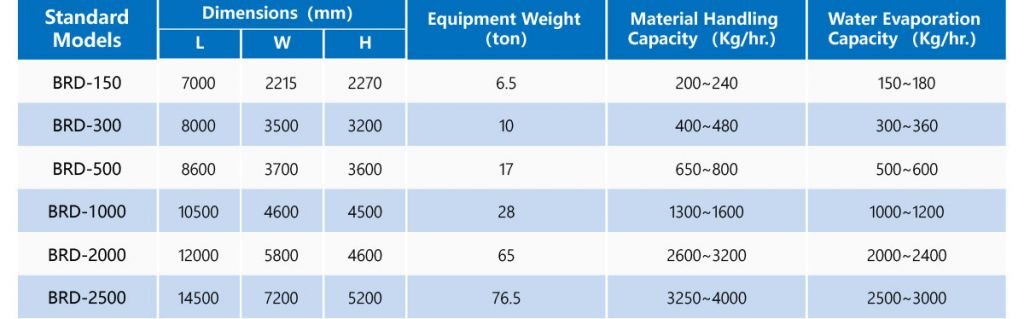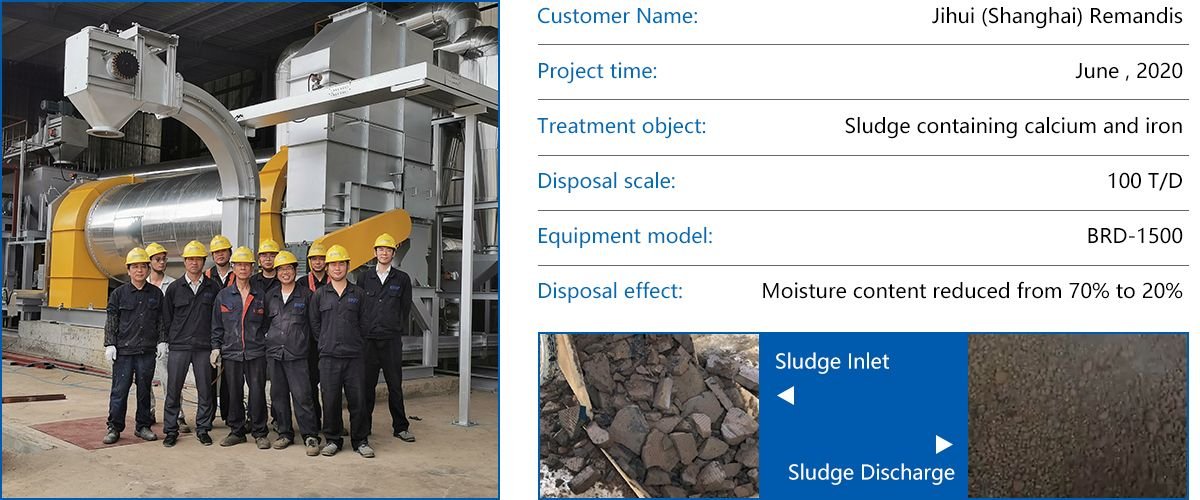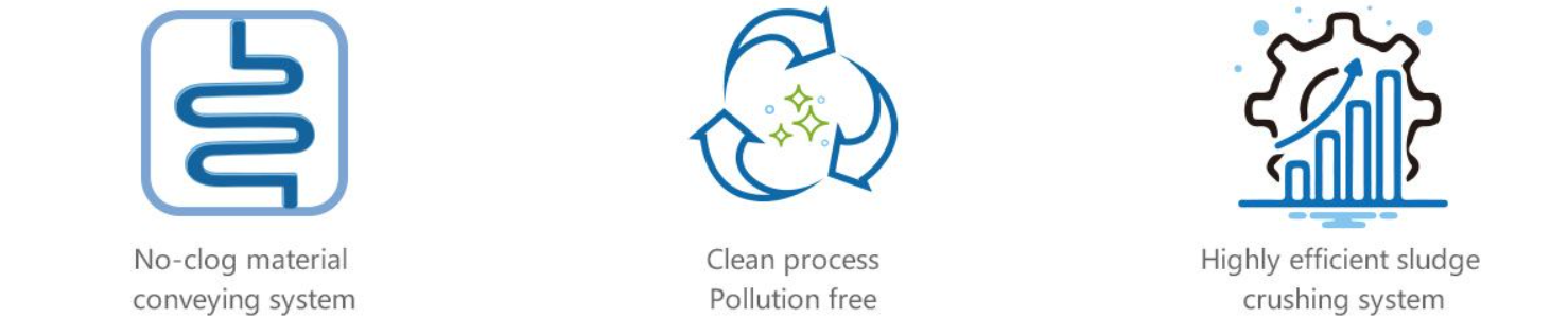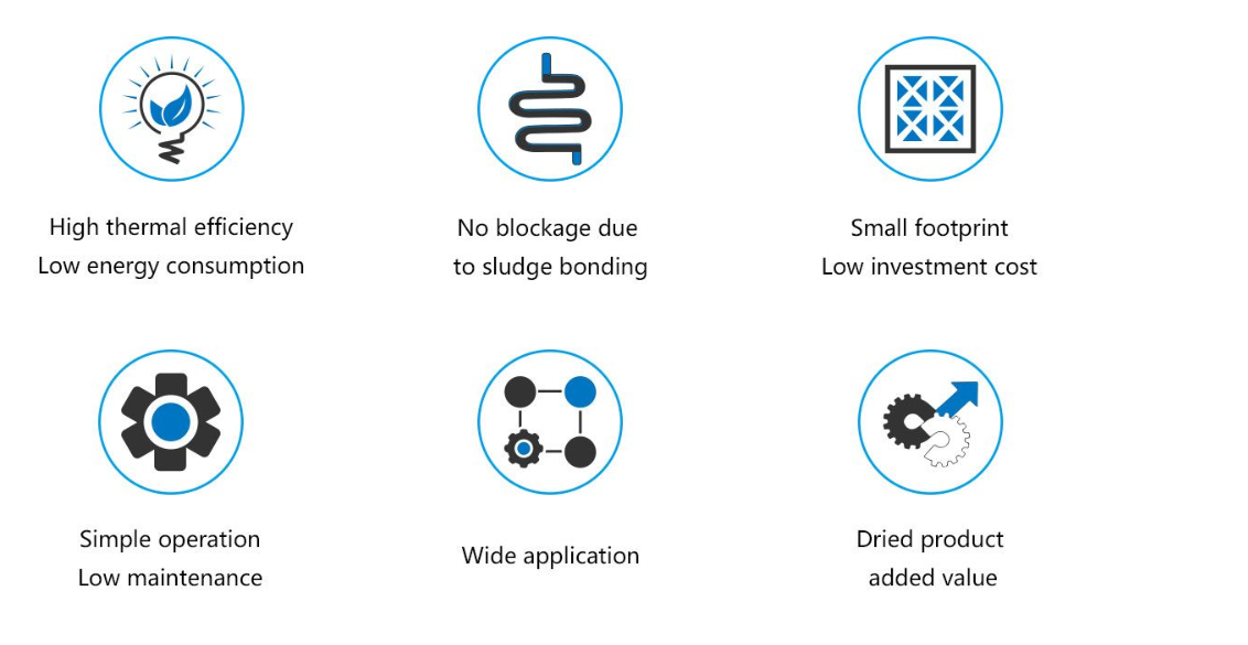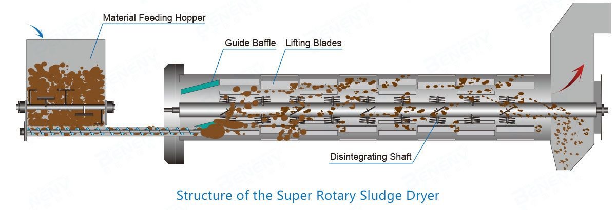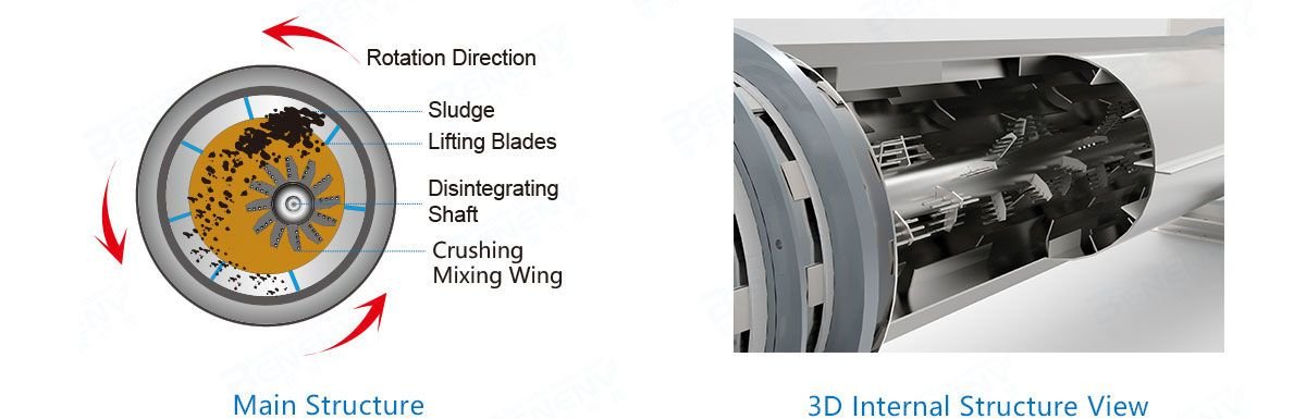 The sludge cake is pre-crushed by the stirring device of the feeding hopper, then conveyed by the twin-screw feeder to the main rotating drum, where the sludge will be crushed into small pieces of size 1-3 mm. The wall plates of the drum drives the small sludge particles forward, by lifting and dropping it, while being continuously stirred and crushed by the disintegrating shaft. The specific surface area of the material increases the contact area with the hot air and accelerates the drying process with high efficiency.